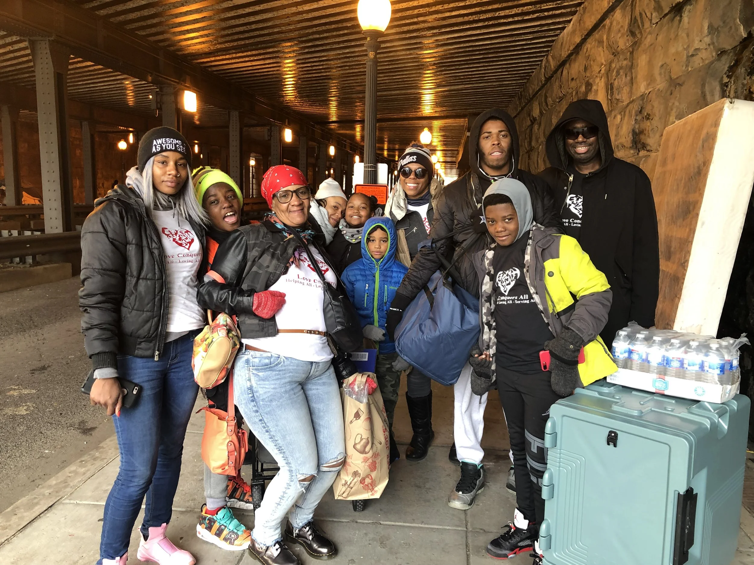 On Thanksgiving Day, Love Conquers All served dinner to the homeless of the Washington DC area on the side of Union Station. Their initial goal was to feed 50, but they received enough food contributions to feed 125 homeless.
